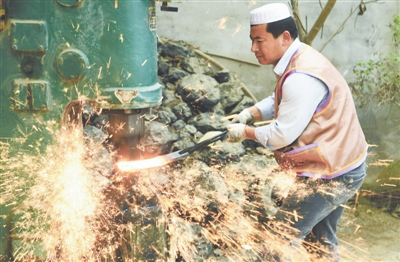 “一带一路”从历史深处走来,这里不仅有商贸的繁荣,更有文化和技艺的交流。那些源远流长的传统技艺,代代相传的工匠精神,经过时光的冲洗,有如一颗颗珍珠,让“一带一路”这条美丽的项链闪耀熠熠光彩。在甘肃省临夏回族自治州积石山保安族东乡族撒拉族自治县大河家镇,保安腰刀锻制工艺第五代传承人之一马尕主麻在使用空气锤锻打刀坯。保安腰刀是出自保安族的传统名刀,用料讲究、工艺复杂,最初是当地百姓的生产、生活工具,现在已成为集实用、观赏、珍藏等功能为一体的工艺品,其锻制工艺被列为国家级非物质文化遗产。