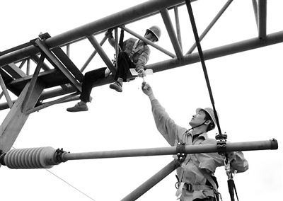 5月4日,南昌局南昌供电段的接触网工正在京九铁路共青城区段给电气化接触网钢柱安装驱鸟器。胡国林 摄