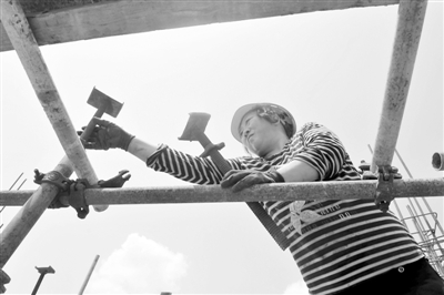 5月9日,在浙江金华市区湖海塘一建筑工地上,有一群来自贵州、河南、四川、陕西等地的建筑女工,与各自的丈夫一起在此打工。每天,她们早出晚归来到工地忙碌,扛钢管、扎钢筋、搬物资,重活累活样样干,被男工友们戏称为“女汉子”母亲。她们是外来务工者、是追梦人,也是现代城市建设的生力军。