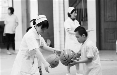 5月10日,在广西柳州市融安县特殊教育学校,一名医护人员和学生玩篮球。当日,融安县人民医院的护士们来到该县特殊教育学校,为孩子们免费健康检查,还给他们送来了画笔、篮球等文体用品,迎接“5·12”国际护士节的到来。谭凯兴 摄(新华社发)
