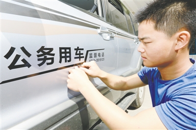 5月10日,在湖北襄阳市直机关汽车维修厂,几辆公车正在喷涂“公务用车”标识和监督电话。5月底前,湖北省各级党政机关公车将喷涂统一标识和监督电话,群众可以拨打监督电话举报。 杨东 摄/视觉中国