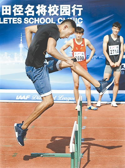 5月11日,来沪参加2017国际田联钻石联赛(上海站)比赛的110米栏运动员奥兰多·奥尔特加、谢尔盖·舒本科夫和谢文骏来到上海市奉贤中学,现场观摩中学生田径比赛,并走上赛道通过亲身示范为学生们进行技术辅导。图为110米栏运动员奥兰多·奥尔特加(前)为中学生示范跨栏技术。