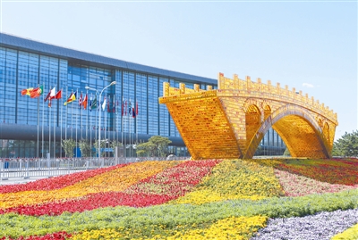 位于北京国家会议中心前的“丝路金桥”景观作品(5月13日摄)。“一带一路”国际合作高峰论坛将于5月14日至15日在北京召开。 新华社记者 侯俊 摄