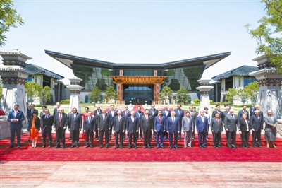 当天中午,习近平同与会领导人和国际组织负责人以国际会议中心“汉唐飞扬”主建筑为背景集体合影。