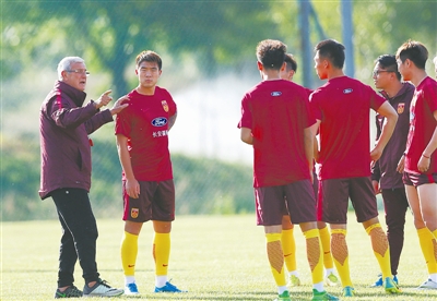 5月15日,中国男足二队主教练里皮(左一)在训练前与队员交流。当日,中国国家男足二队在天津进行集训。 新华社记者 曹灿 摄