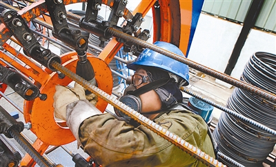 在京沈客运专线建设中,中铁二十二局五公司推行钢筋加工工厂化作业,提高作业效率。图为5月15日工人正在对钢筋笼滚焊机进行松筋操作。华建宇 摄