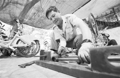 5月16日,山西省太原市,公共自行车一车队修车工喇建中正在使用自己设计制作的修车工具维修受损公共自行车。