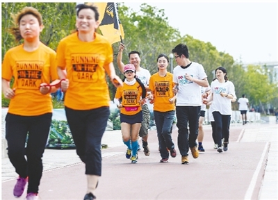 5月20日,在上海市徐汇滨江,陈思颖(右三)在同事的带领下使用牵引绳跑步。