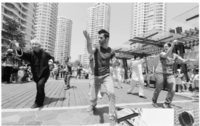 上图:5月18日,在青岛市2017年邻居节上,螳螂拳传承人孙丛宅(左)教授外国邻居学习中国传统武术。