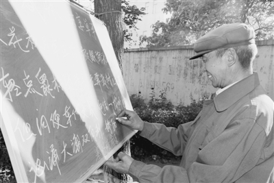 “‘汹涌大潮双向利,娇阳新事笑脸红。’你看这两句咋样?”王海军补上了最后的两句,满意地来回读了几遍,找出一张硬纸片,誊写上去。这还得改上几遍才能上到笔记本上。写完这首诗,王海军和老伴决定收摊了。虽然今天收入不多,但却写出了好几首诗,他笑盈盈地收好小黑板,骑上车:“明天再来!”