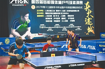 5月20日,2017年第十三届斯帝卡杯全国乒乓球巡回赛启动仪式在北京周庄文体中心举行。在启动仪式上,人民日报社工会与斯帝卡(北京)体育用品有限公司联合举办了“第四届首都媒体杯乒乓球邀请赛”。人民日报、人民网、新华社、光明日报、工人日报、乒乓杂志等十二家新闻媒体的记者、编辑参加比赛。图为参赛选手在比赛中。本报记者 许之丰 摄
