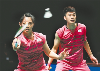 5月22日,中国台北选手李佳馨(左)/王齐麟在混双比赛中。他们以2比0战胜俄罗斯选手叶卡捷琳娜/伊万诺夫。