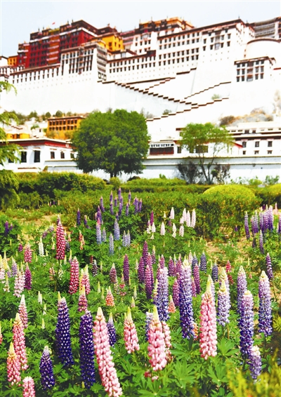 拉萨布达拉宫脚下盛开的羽扇豆(5月23日摄)。