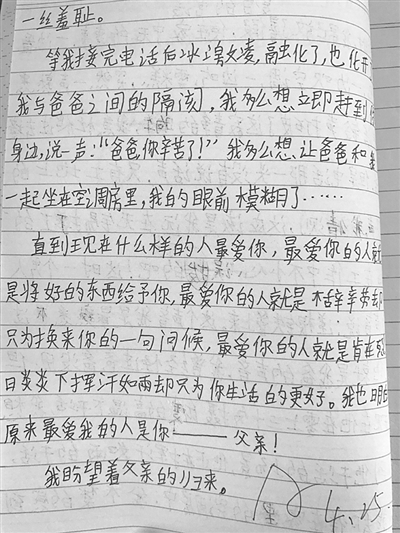 “爸爸我好想好想你,你什么时候可以不用那么忙,我可以倚在你怀里撒欢呢?”丁芳在日记里写下了对爸爸的思念。