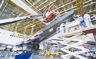 一架国外航空公司飞机在厦门太古飞机工程有限公司机库维修(5月23日摄)。
