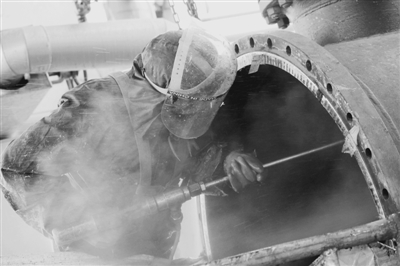 图为施工人员用高压水枪进行打压清洗。车玉花 摄