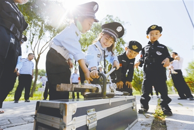 5月25日,河南焦作武陟县公安主题文化园内,孩子们穿着“警服”,体验公安民警的工作。为了加强警营文化宣传,武陟县公安局开展了“警盾伴我成长,快乐幸福相随”主题活动,邀请5岁至8岁的孩子参与角色互换,让孩子们穿上“警服”体验“小交警”“小特警”“小消防员”的工作。图为孩子们在体验操作消防队员的救生工具。