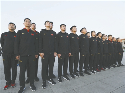 5月26日,中国男篮红队的教练、队员及球队工作人员来到天安门广场观看升国旗仪式,进行爱国主义教育。红队主教练李楠在接受采访时表示:“如何调动大家的积极性(是重点),要让他们从内心愿意为国家队效力,然后才能去谈技战术。”图为中国男篮红队成员在升国旗仪式上。