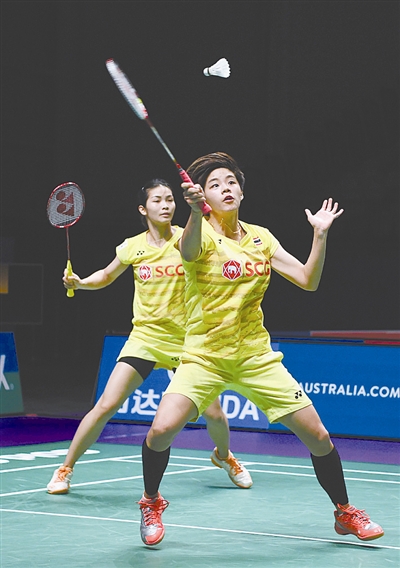 北京时间5月25日,在澳大利亚黄金海岸举行的2017年苏迪曼杯世界羽毛球混合团体锦标赛四分之一决赛中,泰国队以3比2战胜丹麦队,顺利晋级4强。图为泰国队选手基地塔拉库尔/沙西丽(右)在女双比赛中。
