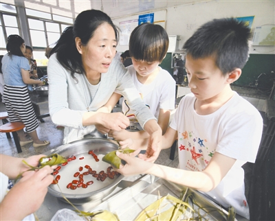5月27日,河北遵化特殊教育中心的老师指导学生包粽子。
