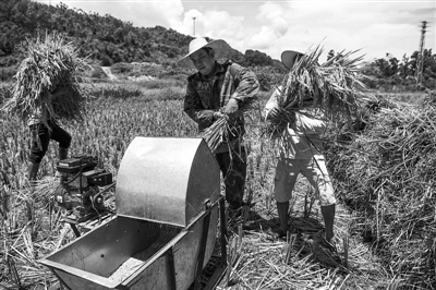 5月30日,番阳村委会开示二村村民刘烈清(中)在田里用打谷机脱稻谷粒。