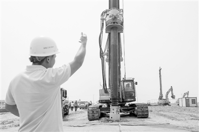 5月22日上午,北京新机场建设工地,随着第一根基础桩的打下,由中国中铁北京工程局北京公司承建的北京到霸州的铁路正式开工建设。京霸铁路作为京九客运专线的重要组成部位,设计时速为350公里,计划于2019年完工。京霸铁路建成后,将直接经过北京新机场,实现高铁站与新机场的零换乘,组成方便、快捷的北京新机场综合交通枢纽。 本报记者 王伟伟 摄