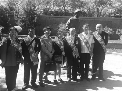 5月27日,来自哈尔滨电业局的全国劳动模范李庆长(右三)和其他劳模与自己的雕像合影。当日,由哈尔滨市总工会打造的哈尔滨市劳动公园、哈尔滨工运历史展览馆迎来了第一批客人——来自哈尔滨市各条战线的劳动模范。本报记者 张世光 摄