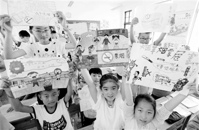 5月31日,江苏东海县实验小学的学生在展示自己绘制的无烟日宣传画。