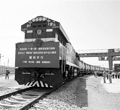 5月26日12时,一辆国际货运列车载着近2000吨化工产品,从库尔勒火车站货场驶出,将于15天后到达目的地德国路德维希港,全程8000公里。