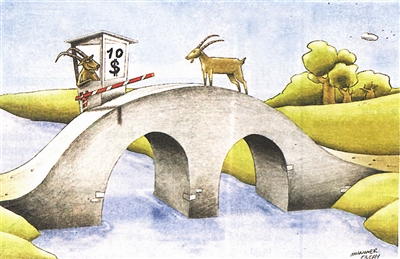 “要从此处过,留下买路财!”画家用寓言比喻乱收费。捞钱者侃侃论道,受害人奈何不得 ,这正是:怪象丛生,异曲同工……【土耳其】奥洛卡伊