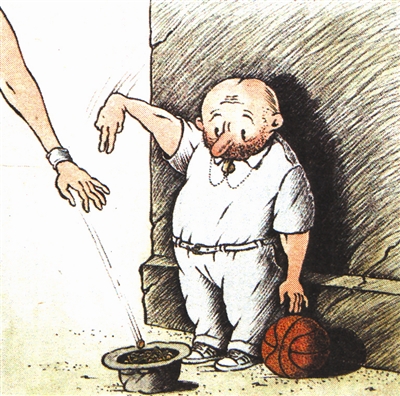 落魄的篮球裁判暂靠街头乞讨度日,令人发笑的是此公积习难改,举臂示意,动作依旧——篮球场上评判的手势。