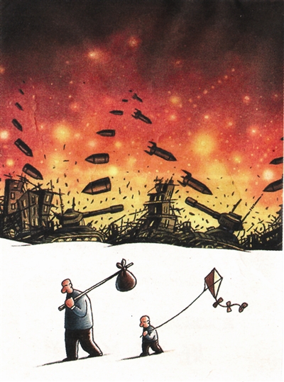 当今世界不太平,有些地方战乱频发,无辜的百姓失去家园、衣食无着。画作描绘枪火中的难民背景离乡,去寻觅和平……