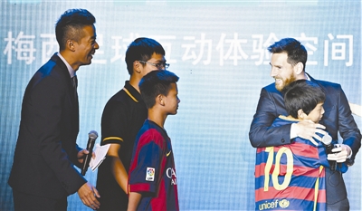 6月1日,阿根廷足球巨星梅西来到北京,参加“梅西足球互动体验空间”启动仪式。这是全世界第一家结合梅西品牌、足球教育和科技体验的互动娱乐空间,通过现代化视觉技术,让观者身临其境地了解和感受梅西的职业生涯和足球的魅力。它将是在中国落地的全球最大的足球主题公园。图为梅西(右一)与中国小球迷拥抱。本报记者 许之丰 摄