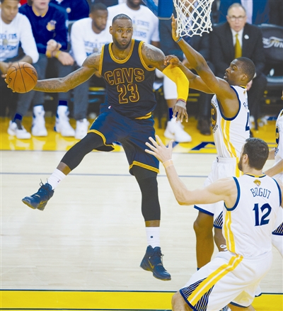 图为2016年6月5日,骑士队球员詹姆斯(左)在总决赛第二场比赛中传球。新华社发