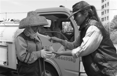 6月4日,志愿者为环卫工人送上绿豆沙冰。