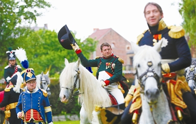 6月3日,在比利时南部小城利尼,拿破仑的扮演者(左)向观众致意。