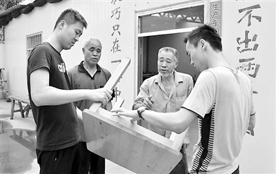 赵树焕(右二)在木器加工厂给年轻人讲解木器加工的技术要求。