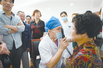 ◀6月6日,眼科专家在湖州市织里镇晓河村为村民检查眼科疾病。