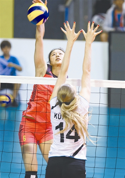 6月6日,中国队球员龚翔宇(左)在比赛中扣球。当日,在瑞士蒙特勒举行的2017年瑞士女排精英赛揭幕战中,中国队以3比0战胜瑞士队。