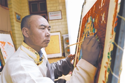 交巴加布在绘制唐卡。本报记者 康劲 摄