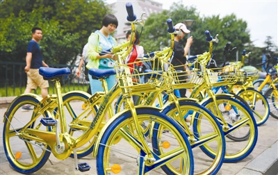 6月8日,民众在北京街头扫码租用一款“土豪金”色的酷骑共享单车。