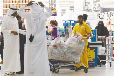 6月6日,人们在卡塔尔首都多哈的商场里采购食物。 新华社发(尼库摄)