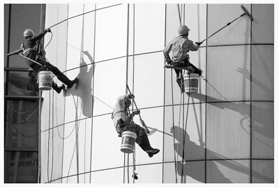 外墙清洗工是一群特殊的城市美容师,被称为“蜘蛛人”。一根绳索,一块木板,维系着他们的生命安全。他们的工作属高危职业,需持有高空作业资格证书。在浙江宁波,清洗高层建筑的外墙一天,每个“蜘蛛人”可以获得500元左右的收入。
