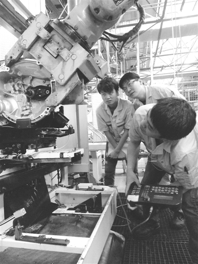 近日,神龙公司襄阳工厂的工人对变速箱试验台架机器人的运行轨迹进行调整,这将使该厂生产的东风雪铁龙、东风标致等系列车型动力总成的质量得到更加可靠的保证。这里的机器人主要用来将装配好的变速箱总成搬运到试验台架进行试验。 叶勇 摄