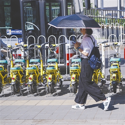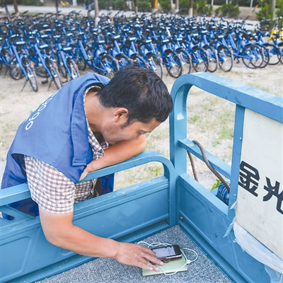 6月1日,北京望京的一处“小蓝车”停放点,调度员薛伟正与同事确认单车的调度情况。