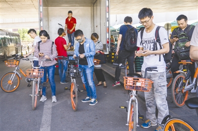 北京的一些地铁口成了共享单车公司投放车辆的必争之地。5月24日上午,正值上班高峰时段,新到的一批摩拜单车(共享单车品牌)被上班族直接从货车上取下骑走。