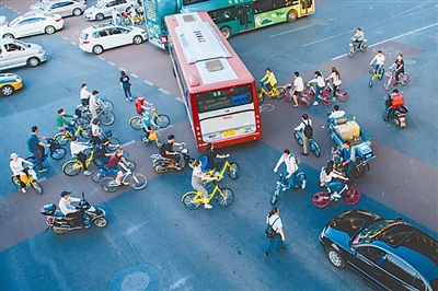 5月23日,北京中关村,人们骑着共享单车穿行在繁忙的十字路口。