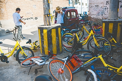 6月1日,北京金盏村的一个角落里,不同品牌的共享单车被随意停放。