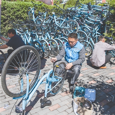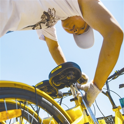 5月23日,单车引导员张金成正在调试一辆新到的小黄 车,他每天要负责上百辆共享单车的停放与维护。