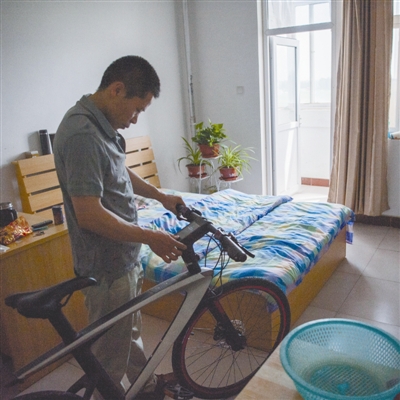 孙玉才公寓里停放的一辆价值数千元的智能自行车,这是他们厂研制的最新车型。